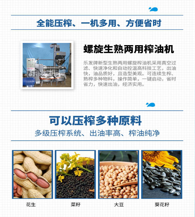 3)此螺旋榨油機(jī)可榨花生、葵花籽、油菜籽、大豆等多種油料;