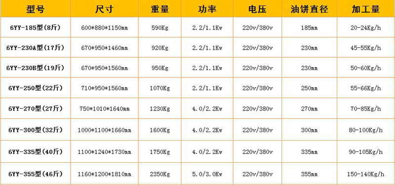 | 型號 | 尺寸 | 重量 | 功率 | 電壓 | 油餅直徑 | 加工量 |