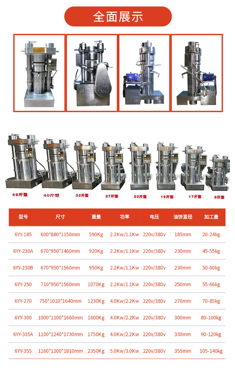 型號 尺寸 重量 功率 電壓 油餅直徑 加工量